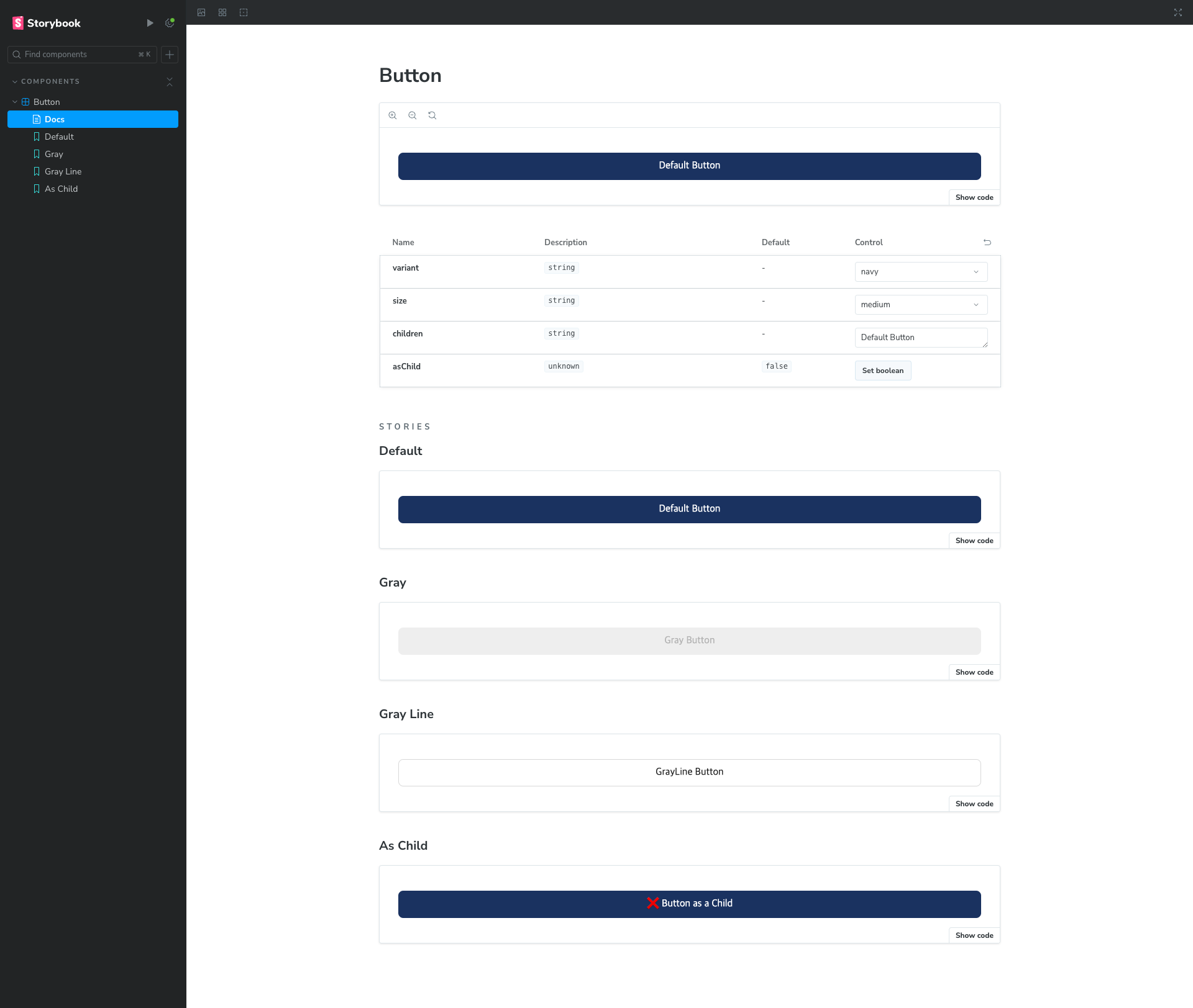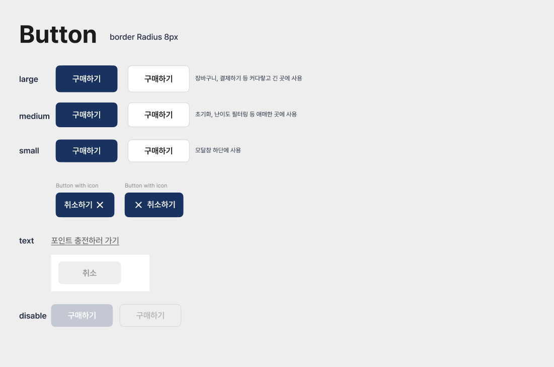Figma에 기획했던대로 맞추어 당장 사용할 navy/gray/grayLine의 variant를 가진 버튼 3개를 추가했고, large/medium/small의 3가지 size를 가질 수 있도록했다. 그리고 default로 navy, medium 속성을 가지고 있도록했다.