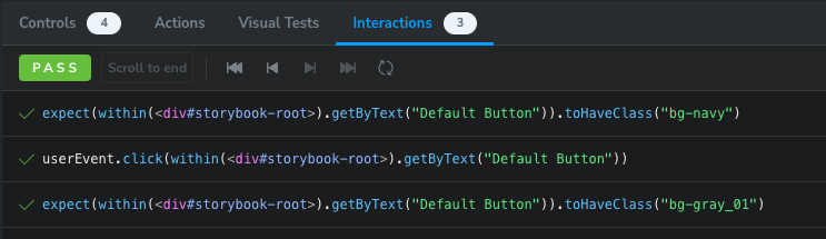 play 기능을 사용해 실제로 어떤 동작이 발생했을때의 상태 변화를 테스트해볼수 있다. 위처럼 기존 색상(navy)를 가진 버튼에 userEvent를 통해 클릭 이벤트가 발생했을때의 시나리오를 작성하여 클릭 이벤트 발생시 버튼이 가지고 있는 class를 통해 gray 색상으로 변경되었는지 확인해보는 테스트코드를 작성해보았다.