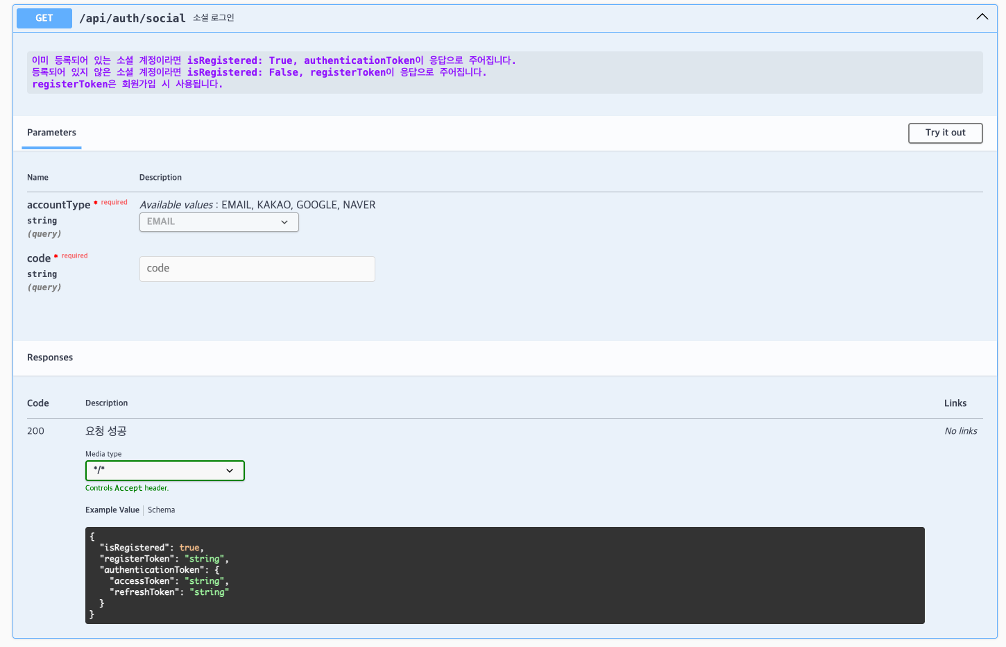 로그인 후 url 파라미터에 code 값을 파싱하여 accountType과 함께 서버에 넘겨줌으로 아래와 같은 Response를 받을 수 있다.